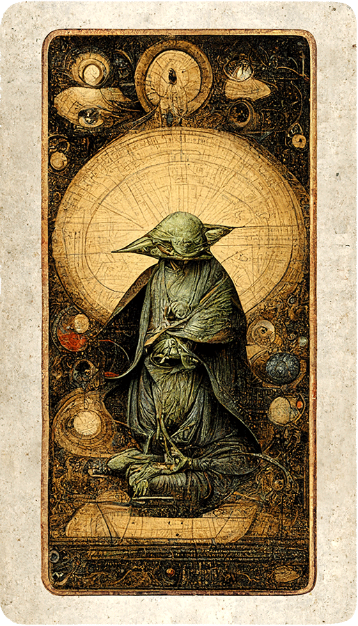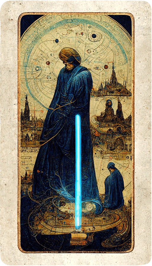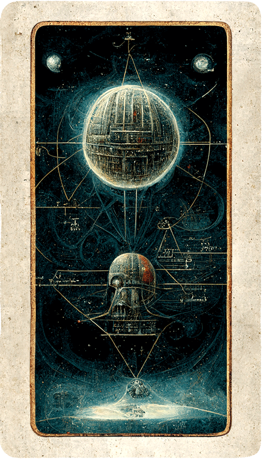 A series of 69 tarot cards representing some characters, vehicles, scenes and situations from the Star Wars universe fromEpisode 4, 5 and 6 made by artificial intelligence (Midjourney) under the concept of Leonardo Da Vinci vision.